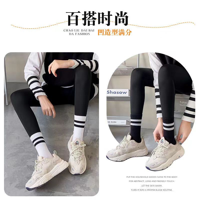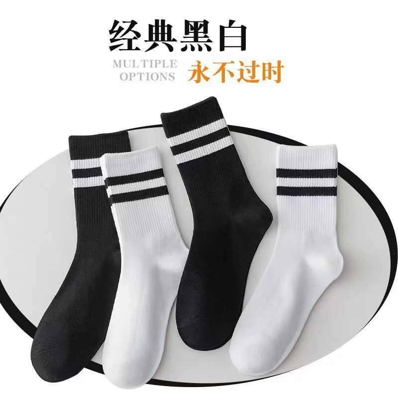 鲨鱼袜子学生高筒运动长袜中筒潮百搭双杠条纹ins长筒黑色黑白