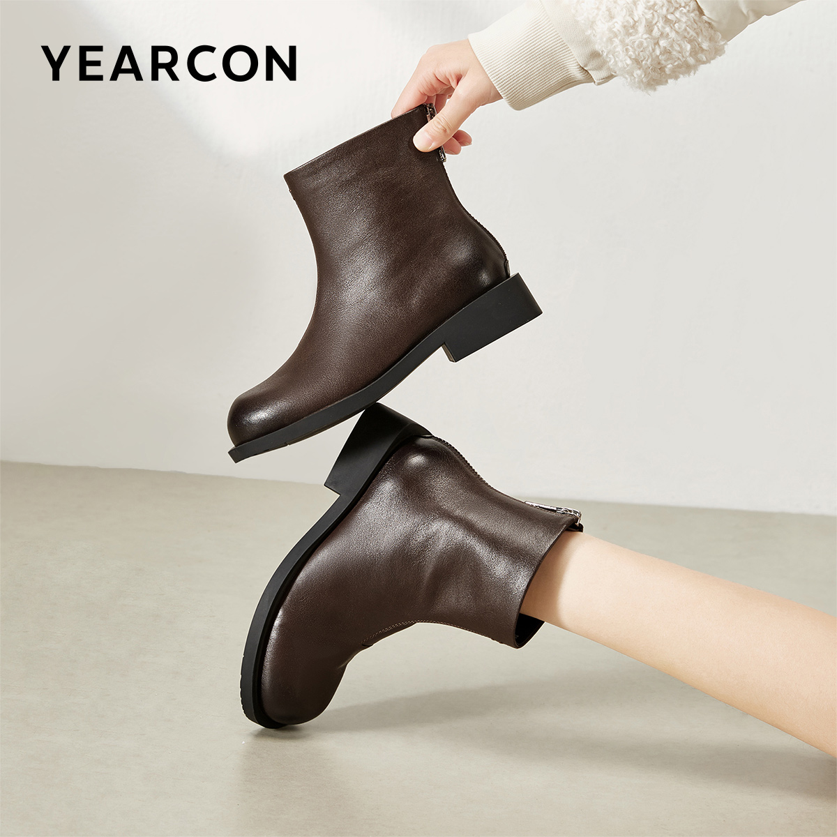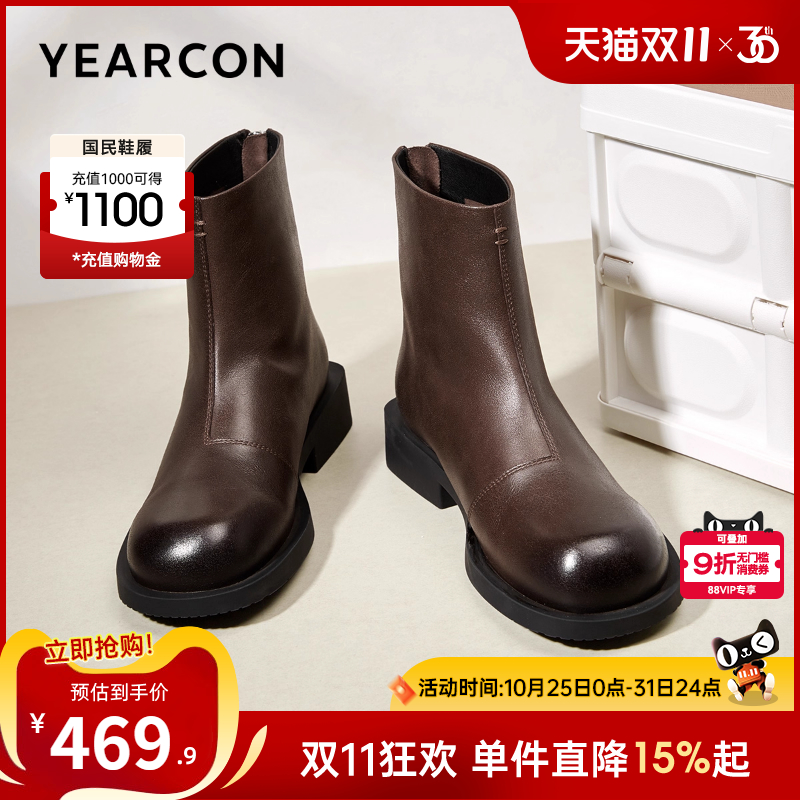 意尔康女鞋秋冬休闲短靴粗跟单靴气质瘦瘦靴复古及踝靴女士皮鞋