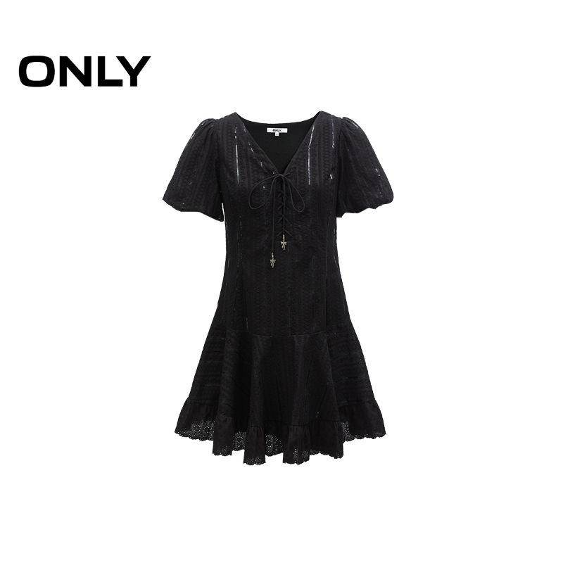 ONLY夏季气质刺绣V领天鹅颈泡泡袖高腰显瘦A字短裙黑色连衣裙女