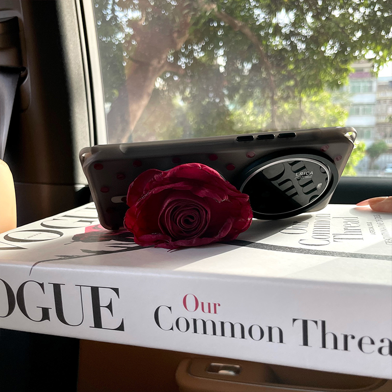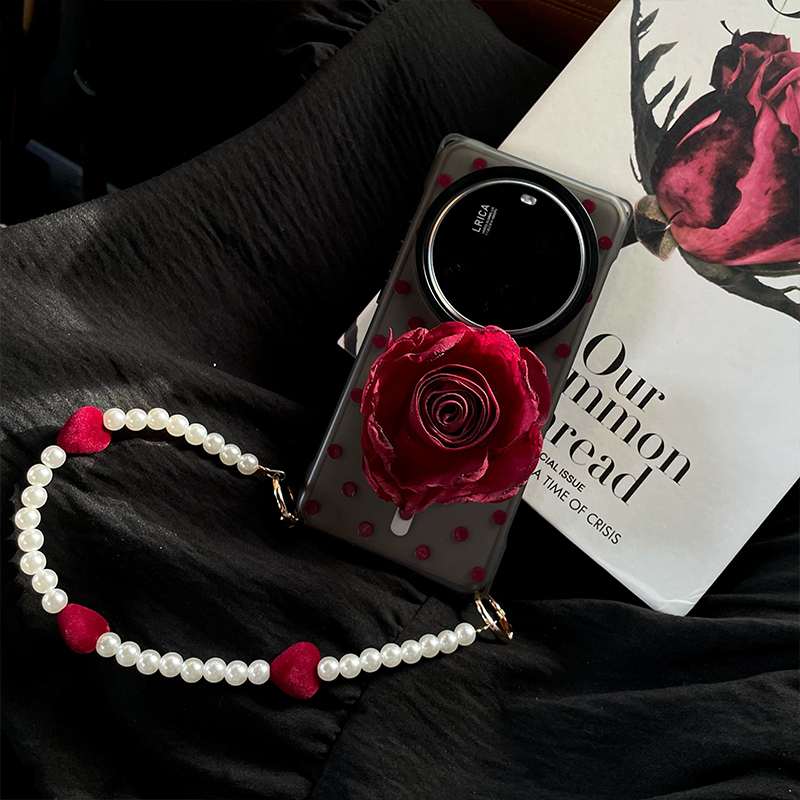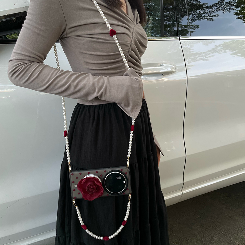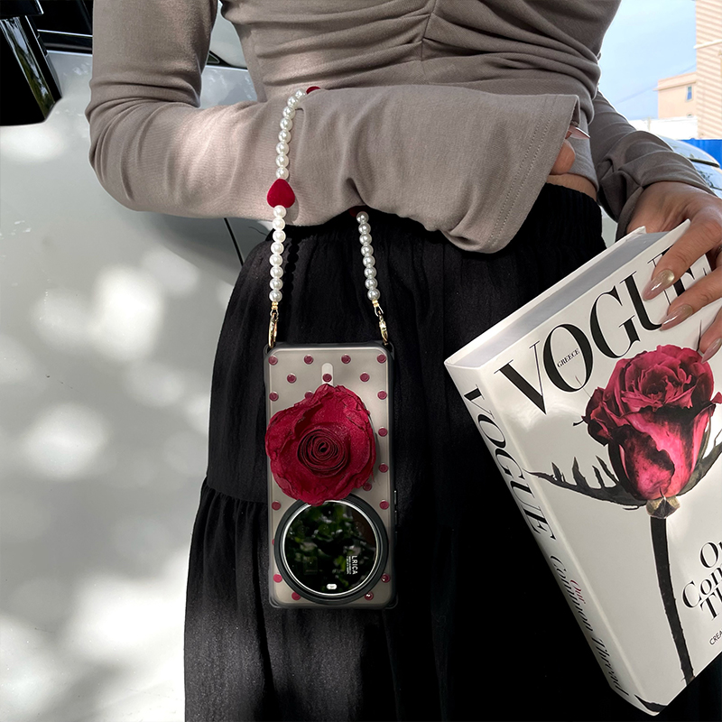 《酒红玫瑰》简约波点磁吸原创爱心珍珠链条适用小米15ultra手机壳斜挎可背华为mate70支架苹果16Pro手提可拎