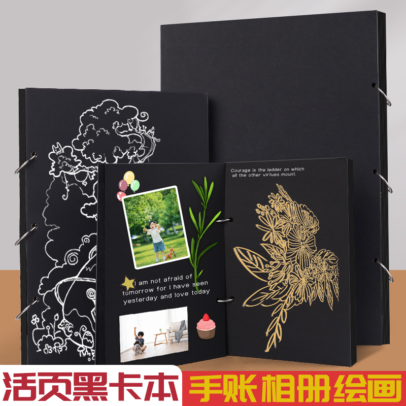 黑卡纸活页本A4手绘8K涂鸦黑色卡纸硬壳diy相册美术生专用A5丙烯16k画本32K绘画本小随身迷你可拆卸画画本子
