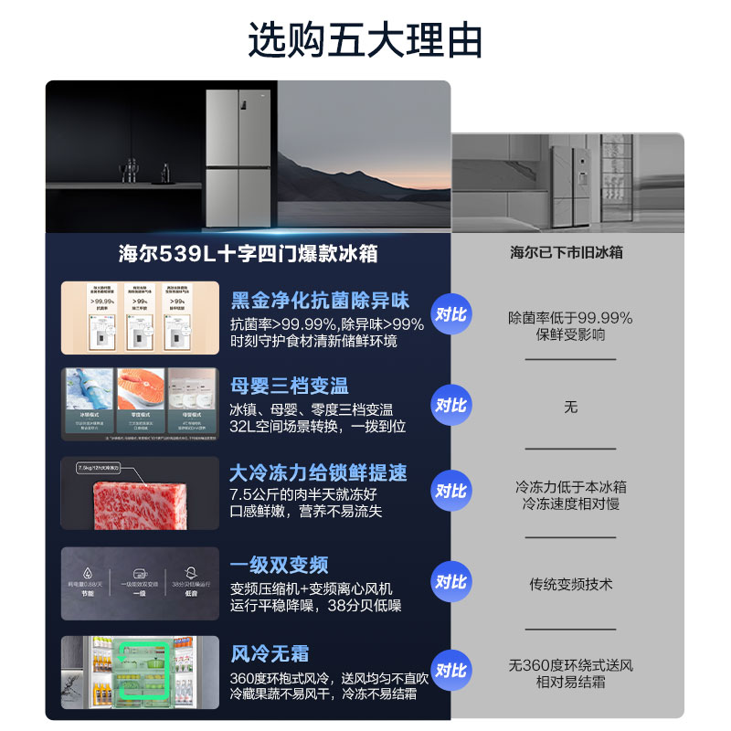 以旧换新补贴海尔539L十字双开四门一级能效无霜电冰箱家用大容量