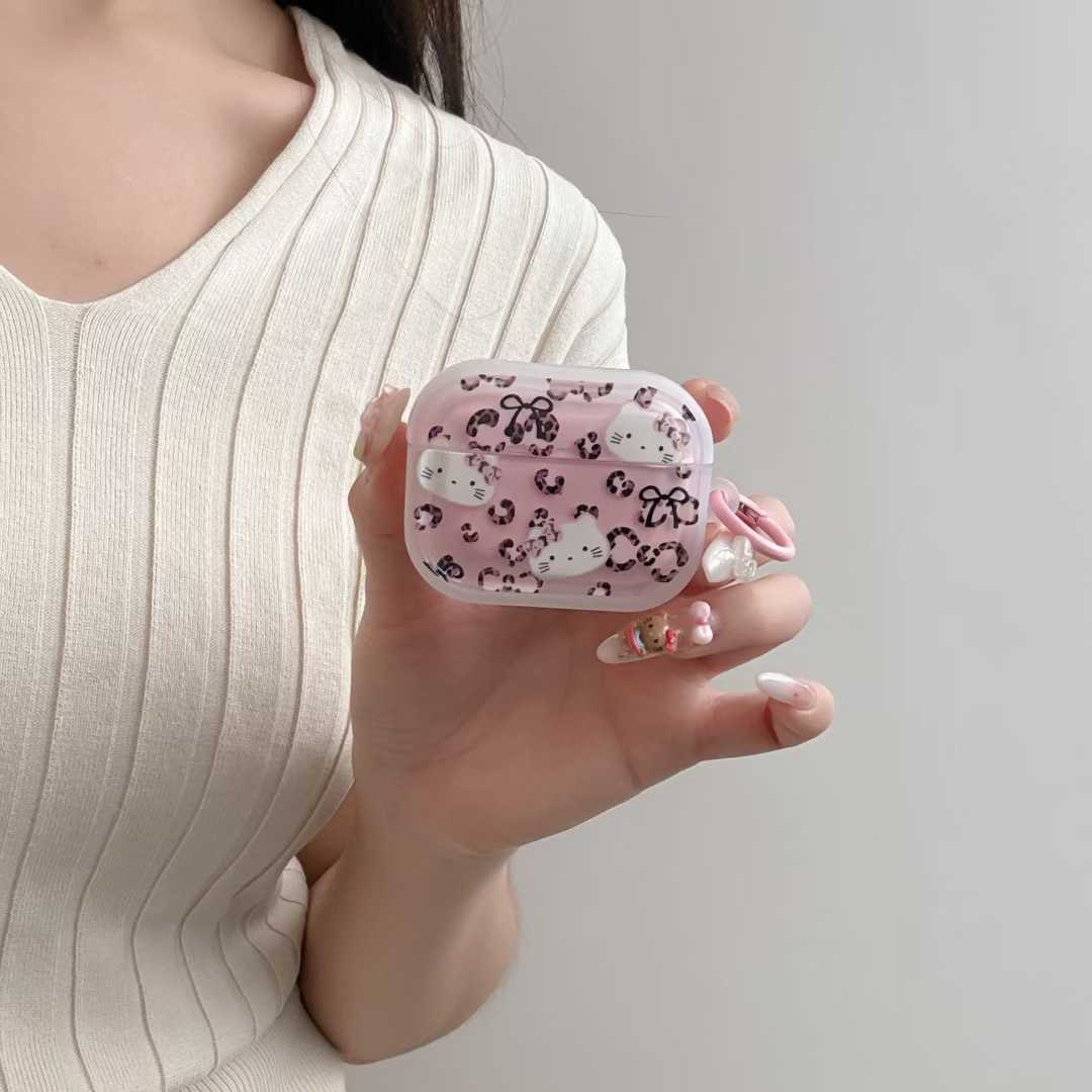 ins粉色豹纹凯蒂猫带挂饰适用苹果airpods4保护套airpodspro2代无线蓝牙耳机套airpods3软壳1/2代卡通挂件