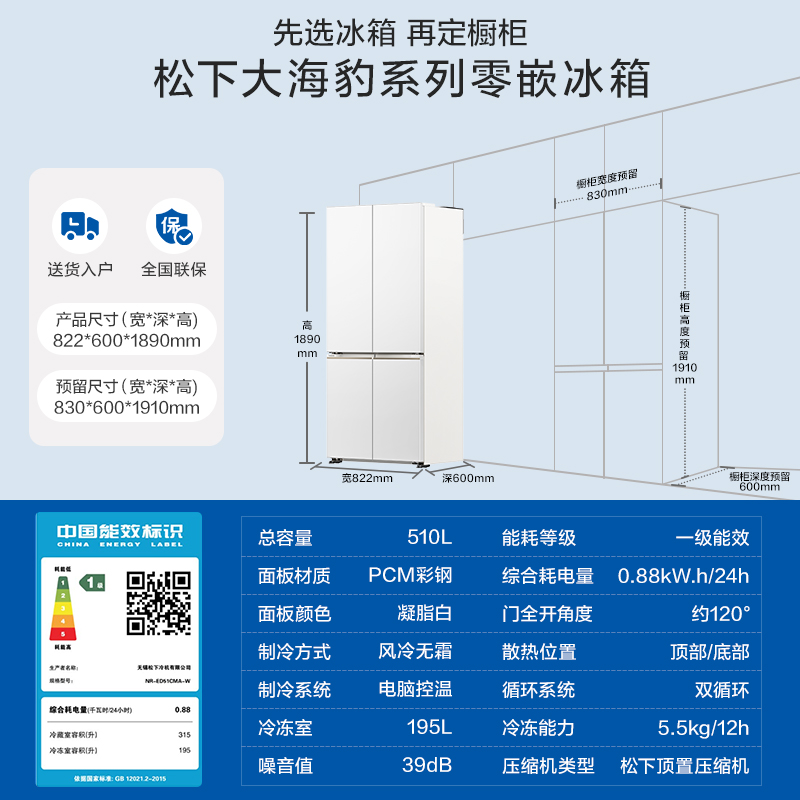 【大海豹2.0】松下510L十字多门零嵌电冰箱一级自动制冰ED51CMA