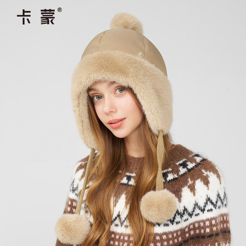 卡蒙鹅绒帽子米貂仿毛绒毛球羽绒护耳帽轻感可折叠防风防寒雷锋帽