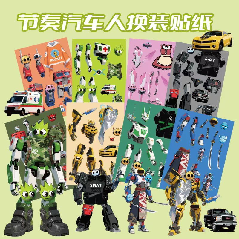 汽车机器人节奏盒子贴纸人物换装免裁剪diy创意手工益智儿童玩具