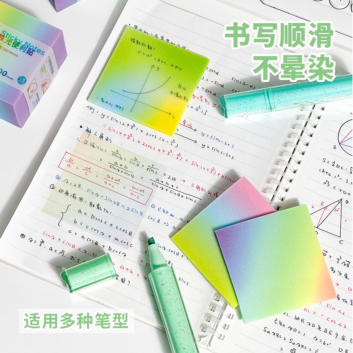 三年二班 小彩砖珠光透明便利贴便签纸粘性强速干初高中生小学生专用标记记事标签有粘性便签贴纸学习文具K