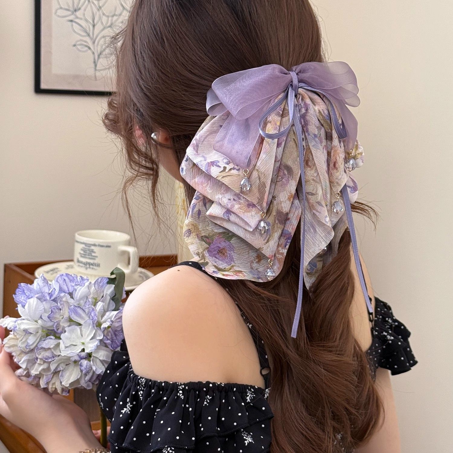 仙女风紫色碎花蝴蝶结马尾夹2025显发量发抓中式高贵典弹簧人鱼姬