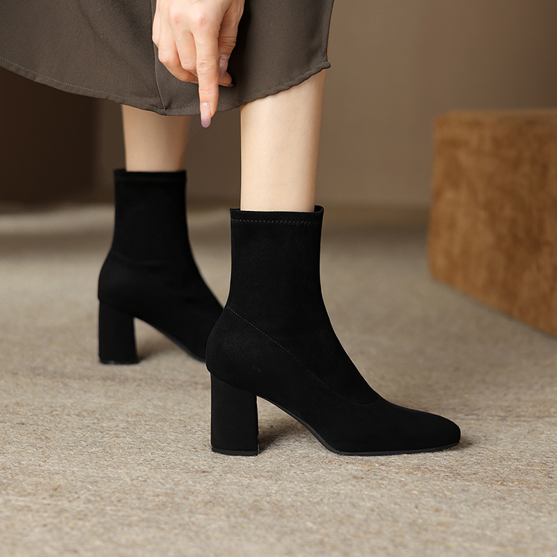 尖头高跟短靴女2025秋冬新款黑色绒面袜靴裸靴粗跟弹力瘦瘦靴子