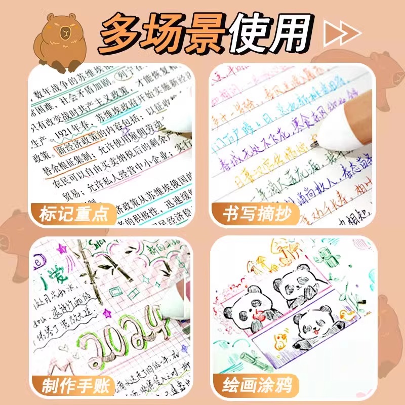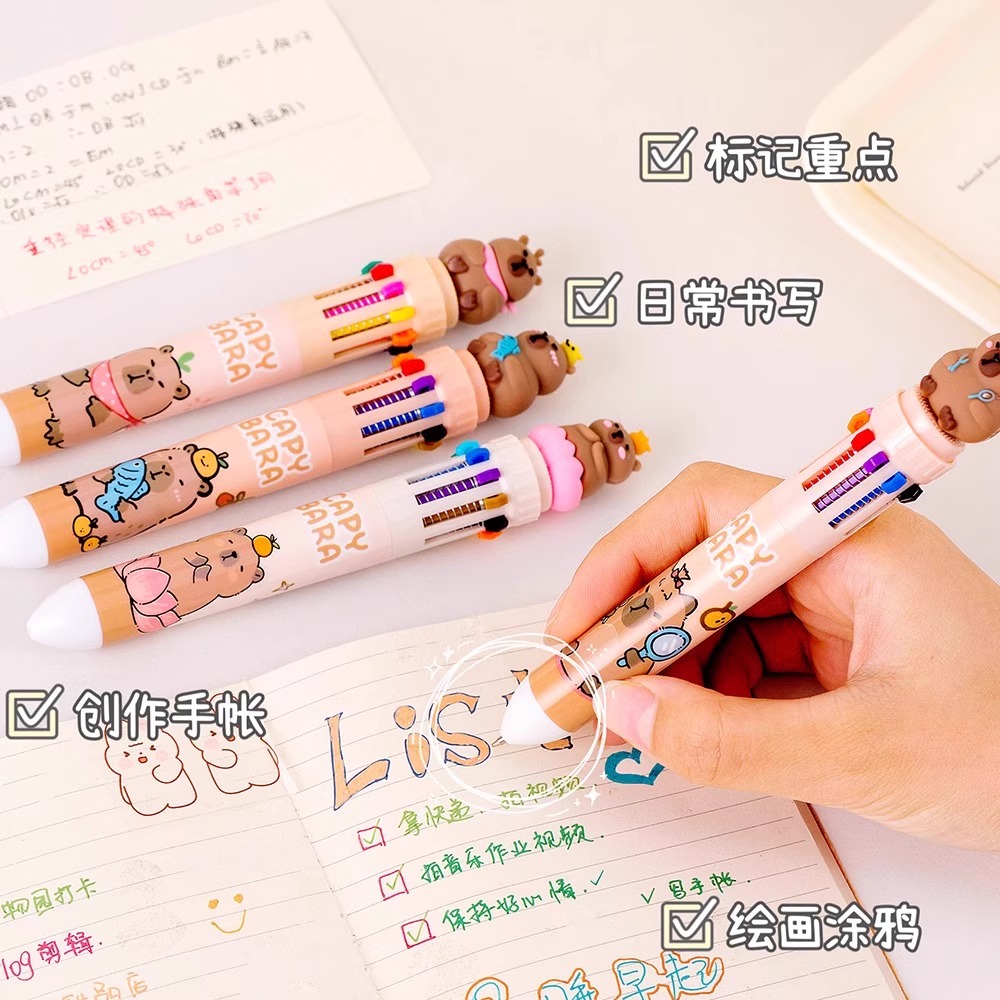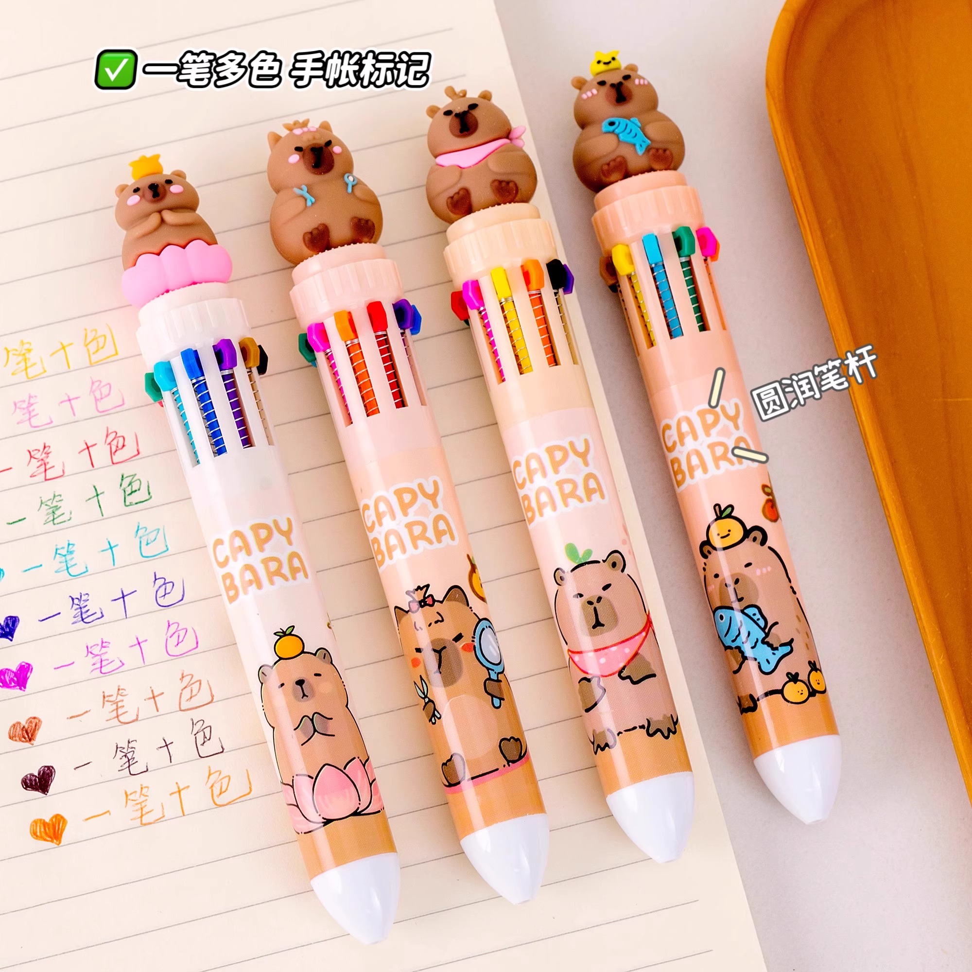 可爱卡通造型创意十色按动笔彩色手账高颜值卡皮巴拉10色圆珠笔小学生礼物中性笔水豚动物造型多功能小学生用