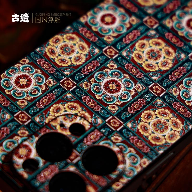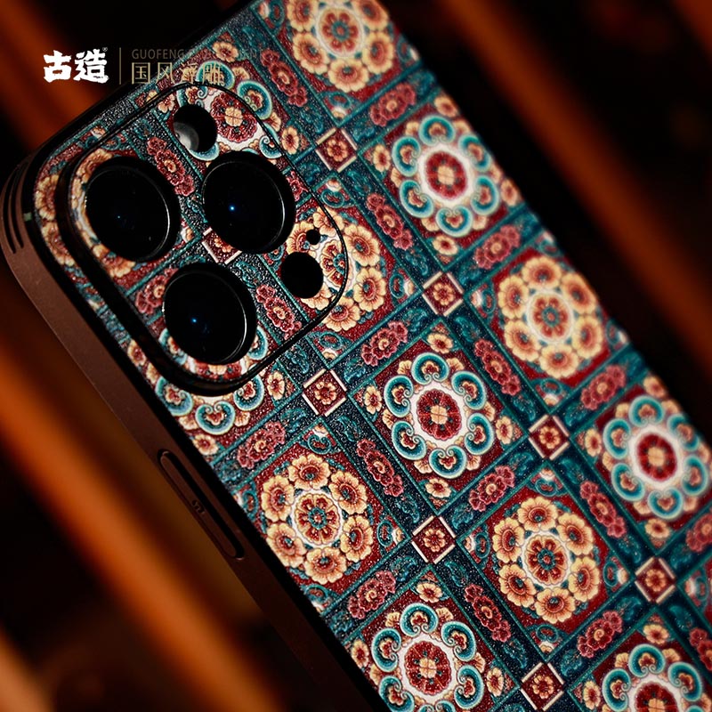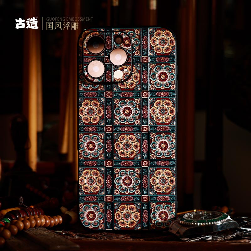 古造 棋格团花 皮纹手机壳适用iPhone16promax苹果15pro浮雕中国风14pro国潮iphone13手机保护壳佛系