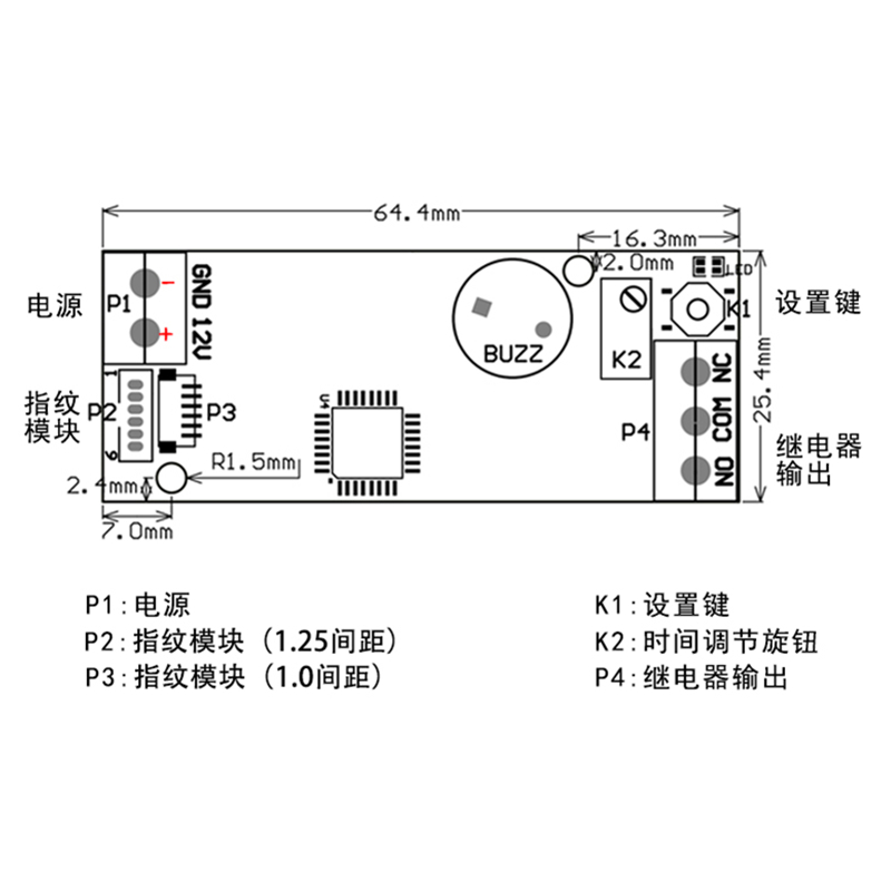 指纹控制电路板门禁锁方案 12V供电继电器触点输出 吸合时间可调