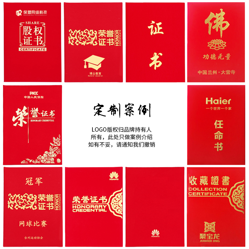 红色绒面证书定制奖状外壳颁奖封面封皮证书套制作保护套内芯打印