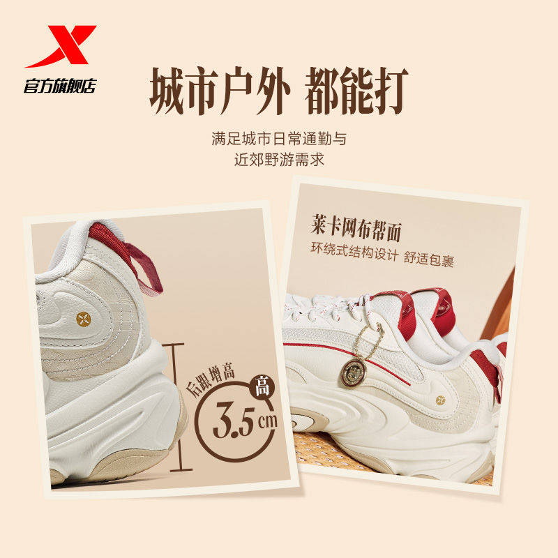 特步星火休闲鞋男鞋秋季革面轻便百搭厚底增高女鞋网面透气运动鞋