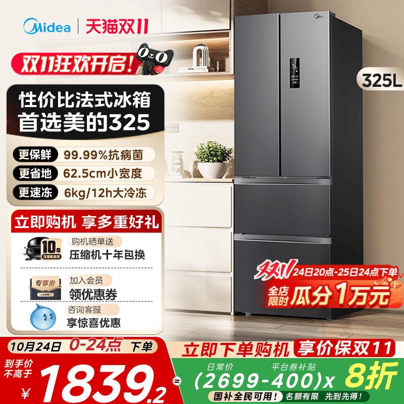 美的325升法式双开四门电冰箱家用一级能效小户型出租房风冷无霜