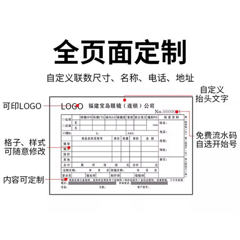 眼镜店验光配镜处方单收据验配收据电脑视光检测服务凭证定配销售订单小票视觉检查表手写开票开单本单据定制