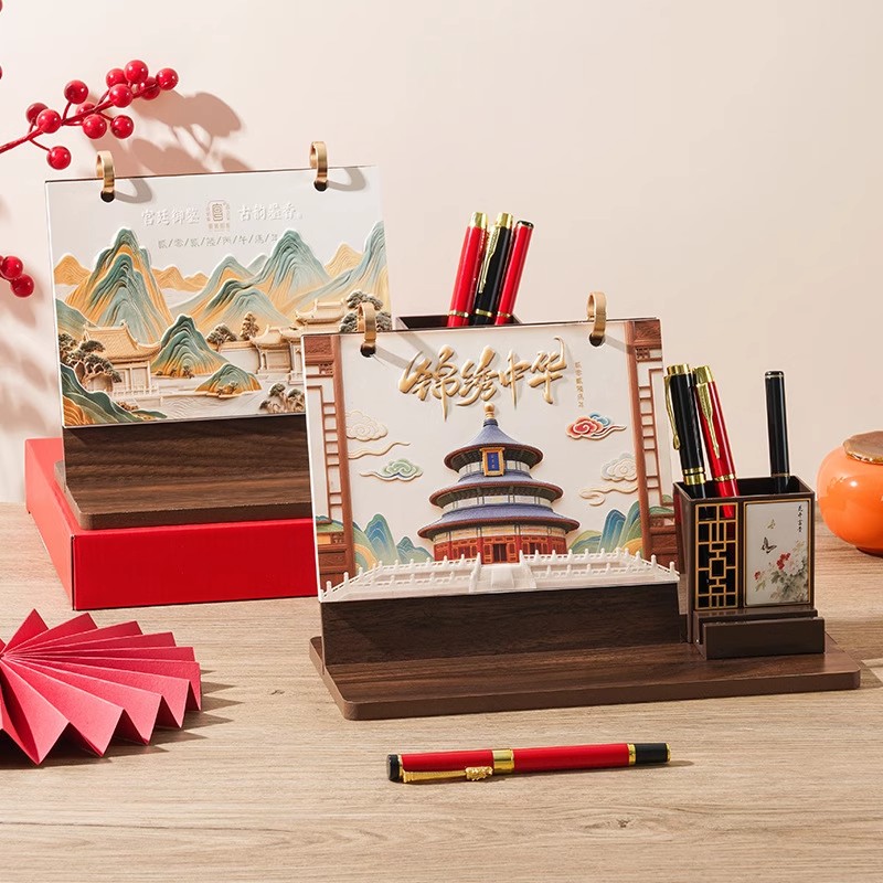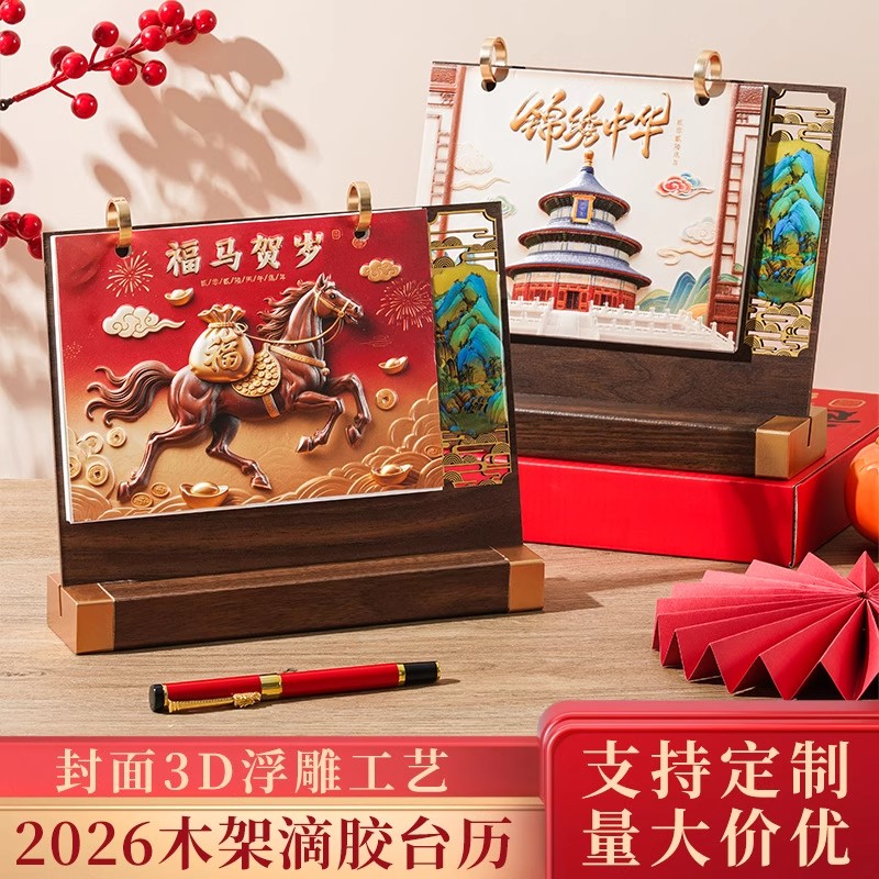 2026年台历国潮风定制logo马年办公桌面木质日历摆件企业广告浮雕来图带笔筒高端商务月历年历定做订制