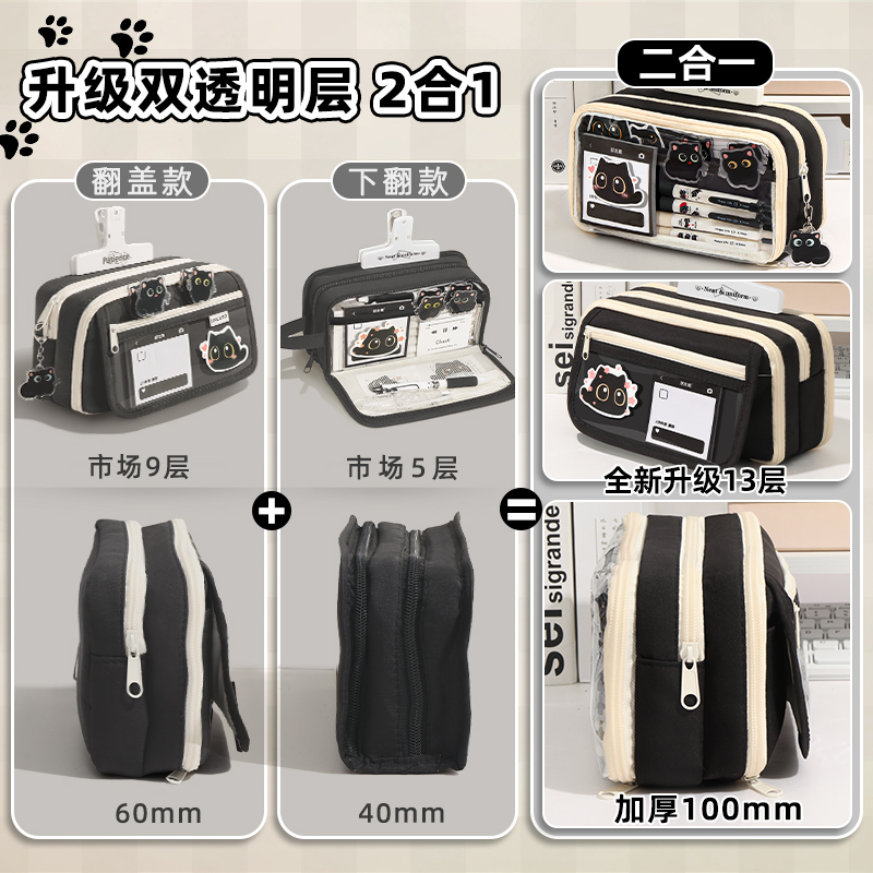 2025新款大容量透明痛包黑色猫咪笔袋女孩小学生文具盒铅笔盒笔袋文具袋初中生铅笔袋高颜值多功能简约ins风2