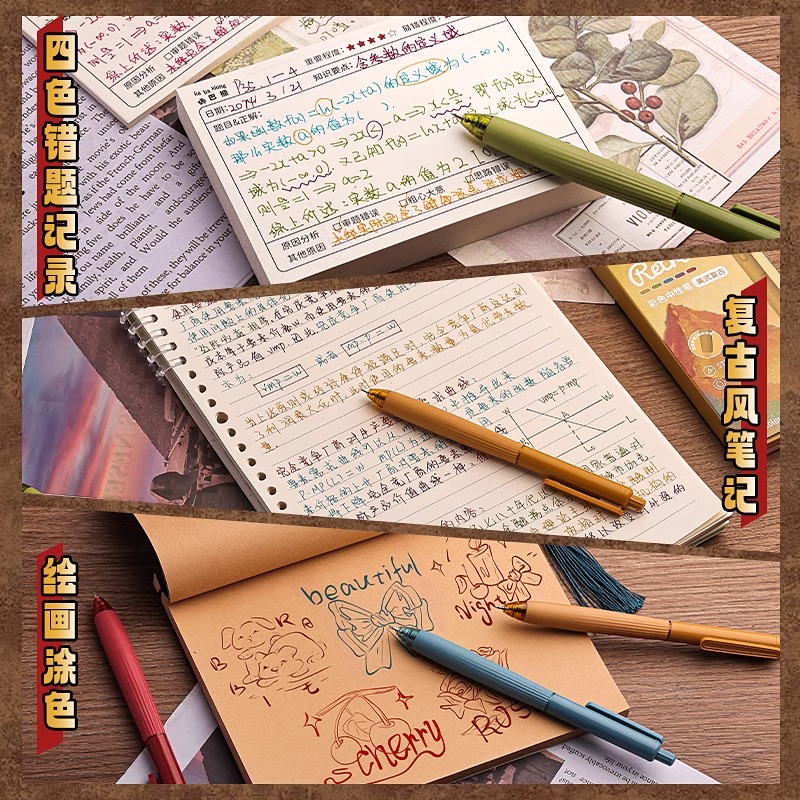 复古彩色中性笔做笔记红笔学生专用课堂学习笔记彩色笔划重点颜色标记笔速干按动式手帐账记号笔高颜值ins风