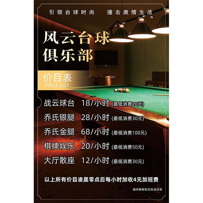台球厅价目表台球俱乐部桌球台球室价格表展示牌俱乐部时长价钱价目展示牌收费亚克力价格表设计制作标价牌