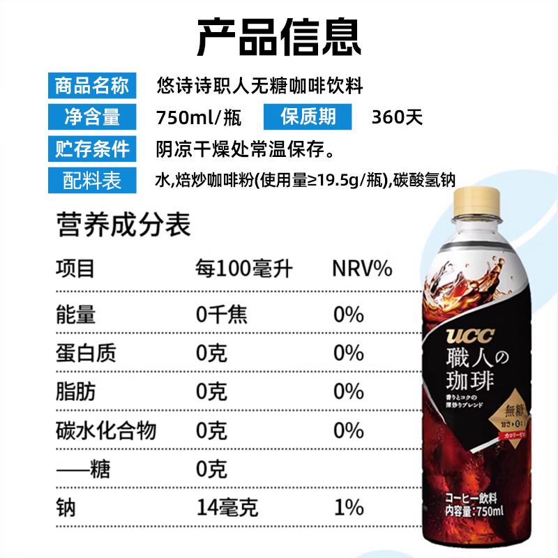 UCC悠诗诗职人无糖黑咖啡美式即饮咖啡750ml瓶装整箱饮料0脂0浓缩