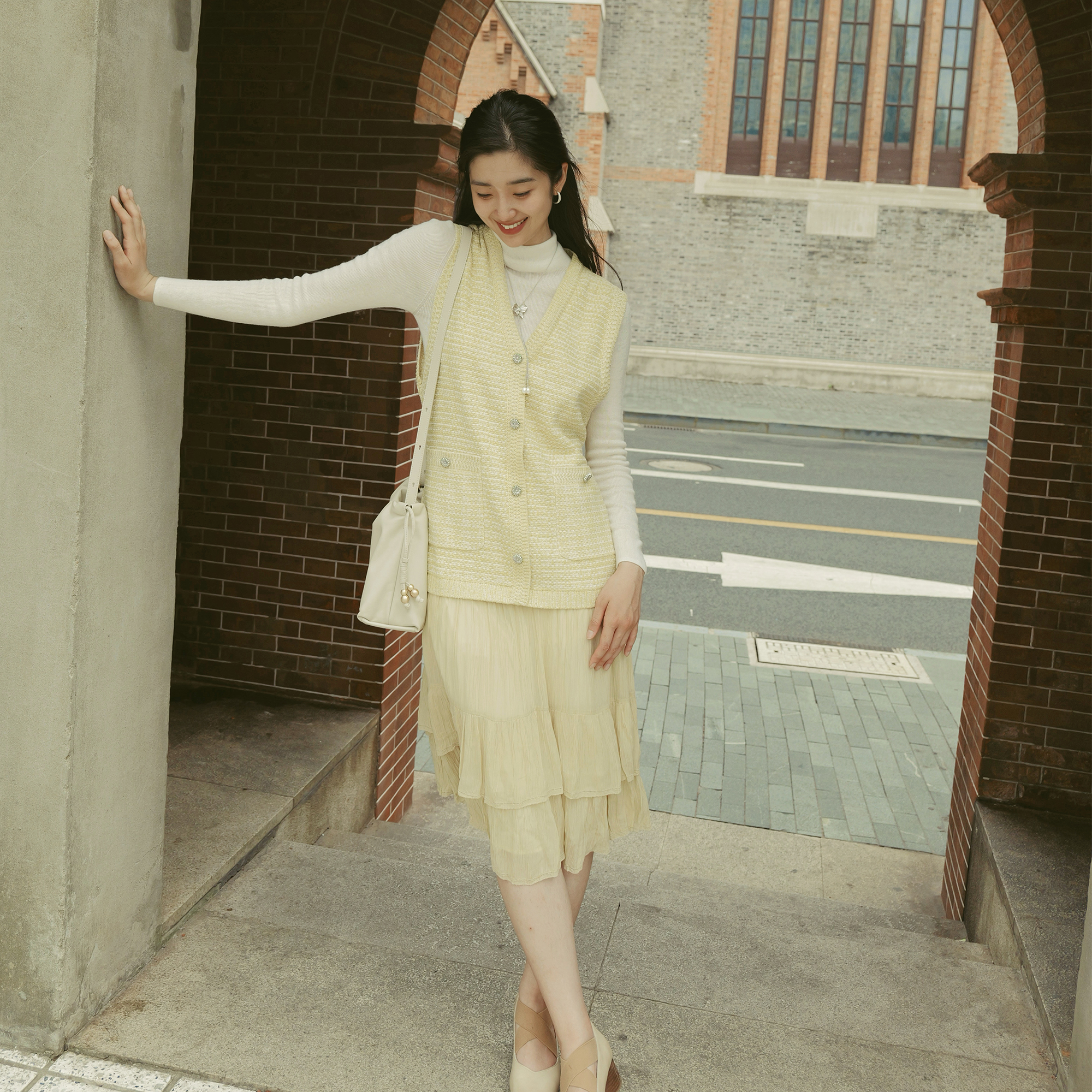 MSLAN知识分子 25秋法式复古拼接连衣裙针梭拼背心裙奶油黄中长裙