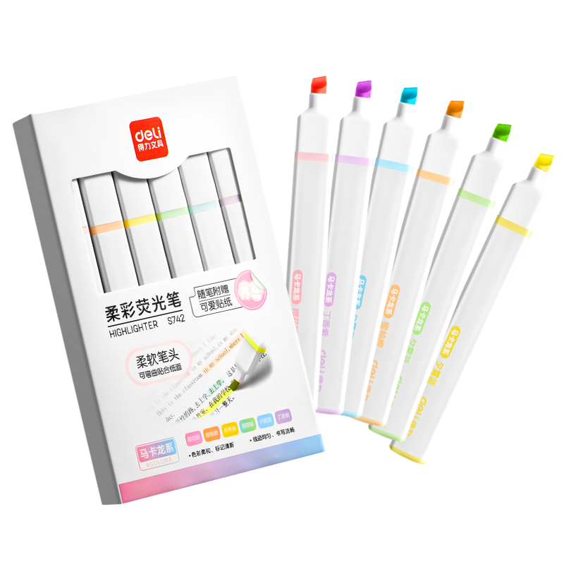 得力软头荧光标记笔学生用彩色划重点记号笔初中生做笔记专用笔记重点标记笔小学生大容量黄色银光笔涂色笔