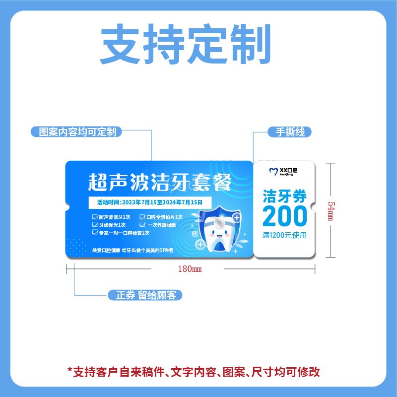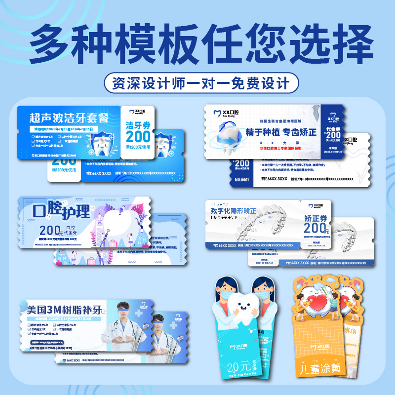 口腔牙科诊所代金券定制儿童涂氟抵用券种植牙补牙兑换券订做畸形牙齿矫正洁牙VIP体验卡优惠券设计制作印刷