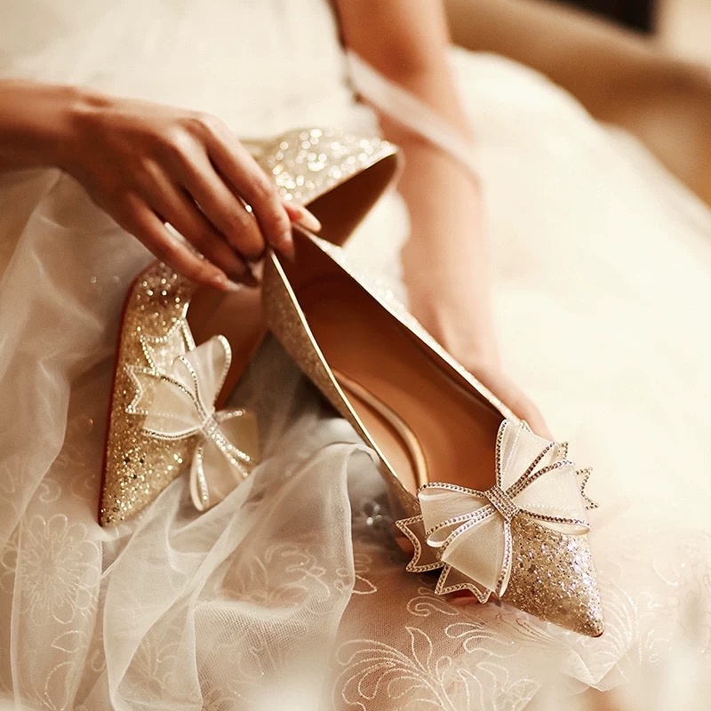 婚鞋女2024年新款主婚纱新娘鞋亮片香槟色水晶鞋尖头细跟高跟鞋女