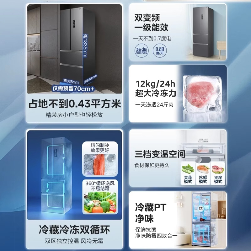美的508法式双系统多门净味四门双循环无霜一级大容量家用冰箱