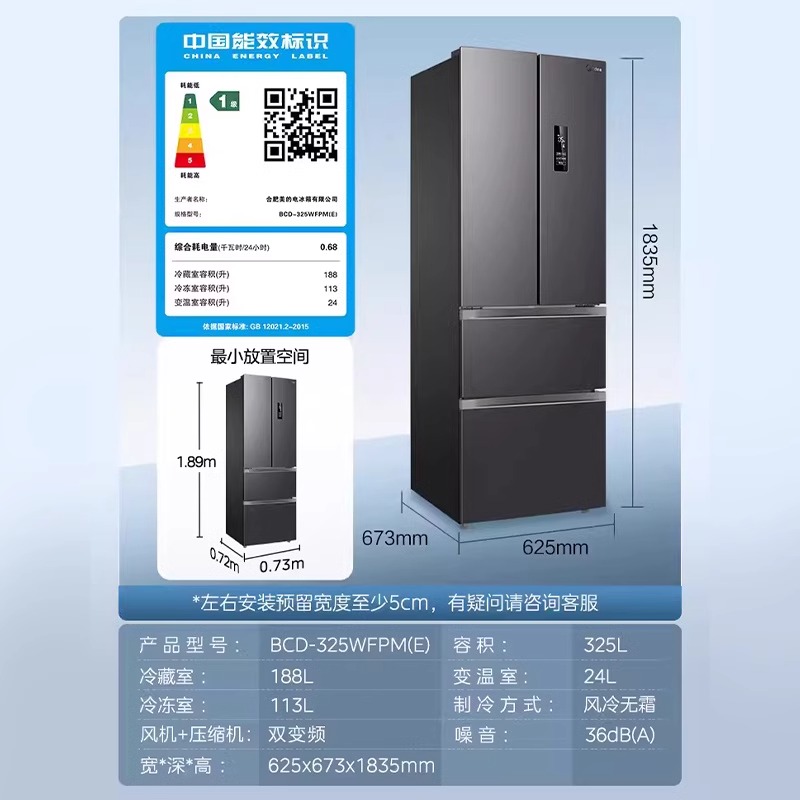 美的325升冰箱四门法式多门一级能效家用中型双开门变频风冷无霜