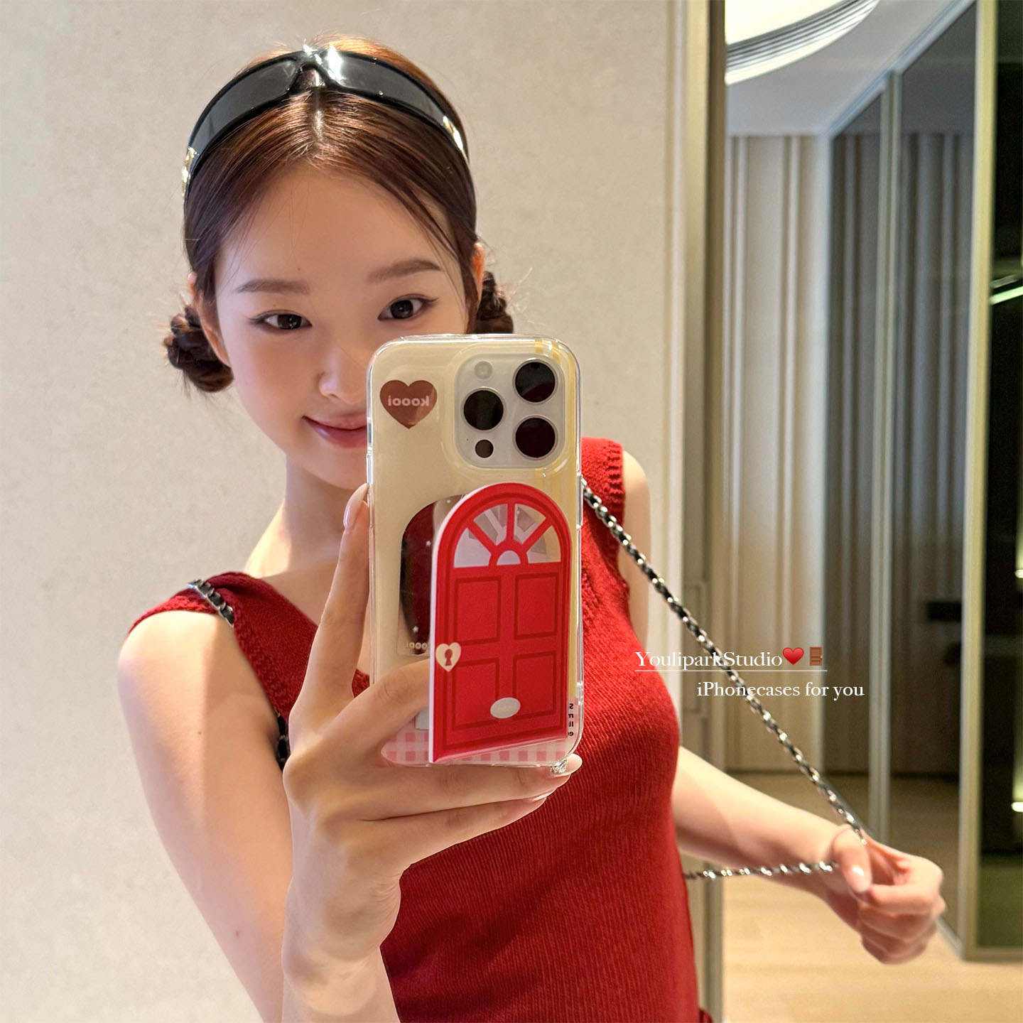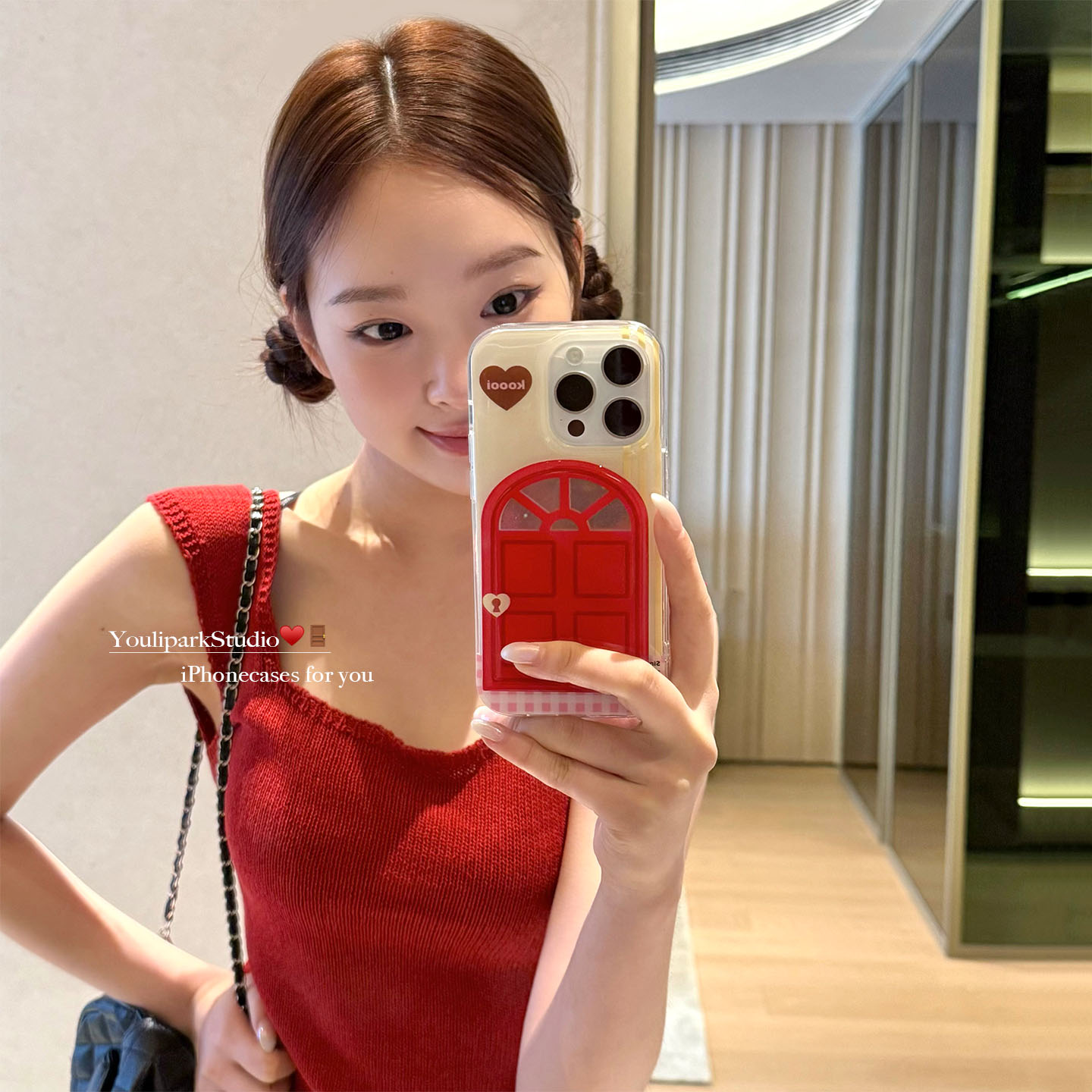 由里公园ins韩系复古红爱心镜面门窗支架15适用16pro苹果16ProMax手机壳iPhone16全包14新款14Promax保护套女