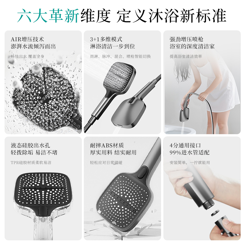 四季沐歌卫浴增压加压淋浴头手持花洒喷头洗澡方形浴室莲蓬头套装
