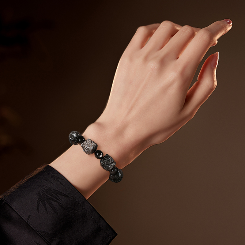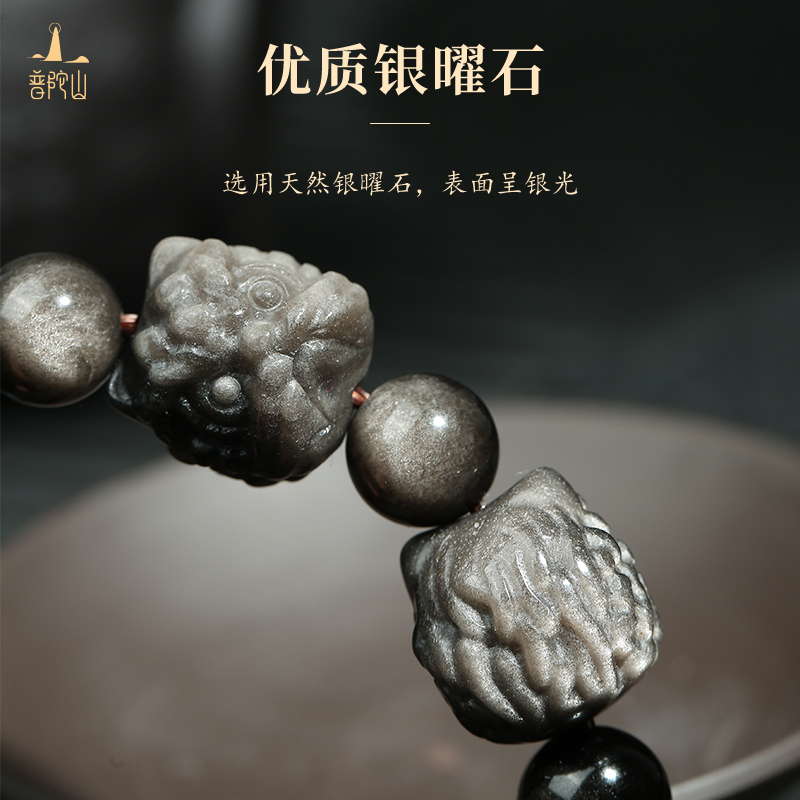 普陀山黑曜石手串银曜石手链男醒狮招财转运手链女新中式国风礼物