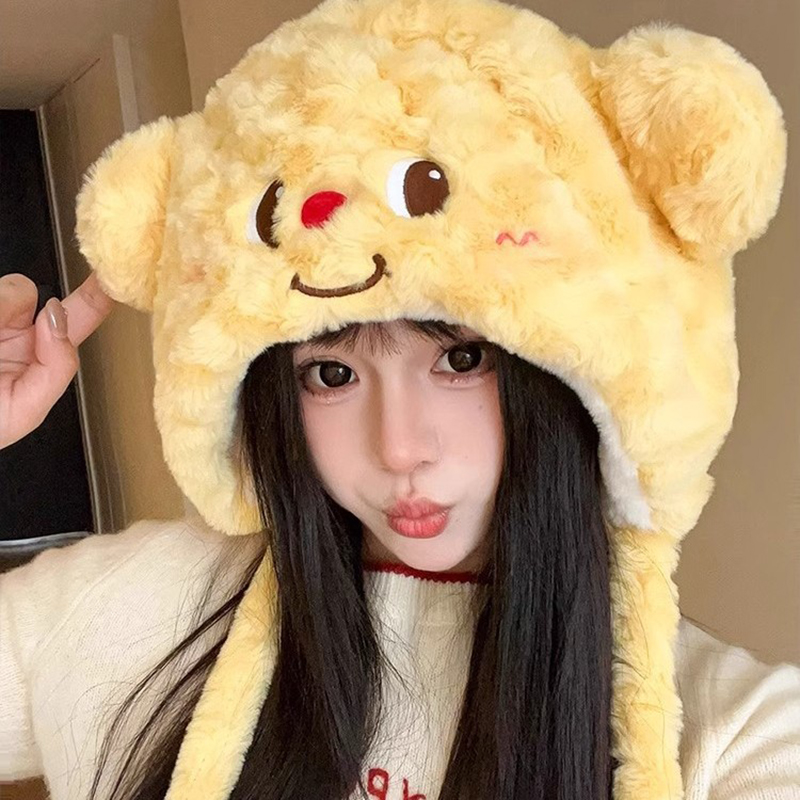 可爱黄油小熊毛绒帽子女显脸小护耳保暖秋冬一体防寒保暖加厚雷锋
