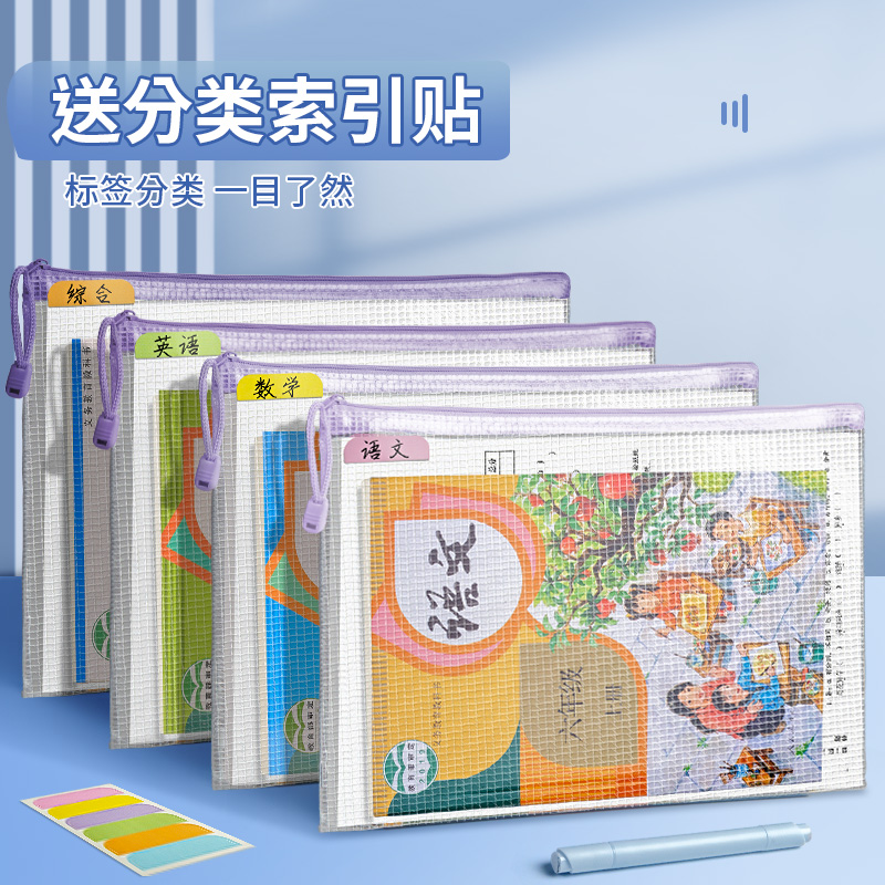 学科科目分类文件袋拉链式双层大容量小学生用资料书本课本分科书袋试卷收纳袋学生装卷子作业袋子A4透明网纱