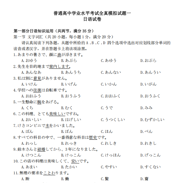 江苏省普通高中学业水平考试合格考日语小高考模拟试卷含答案电子