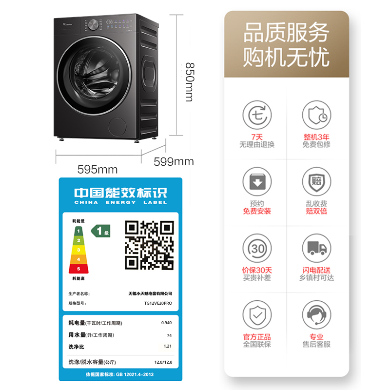 [新品12公斤1.21洗净比]小天鹅水魔方滚筒家用全自动洗衣机VE20