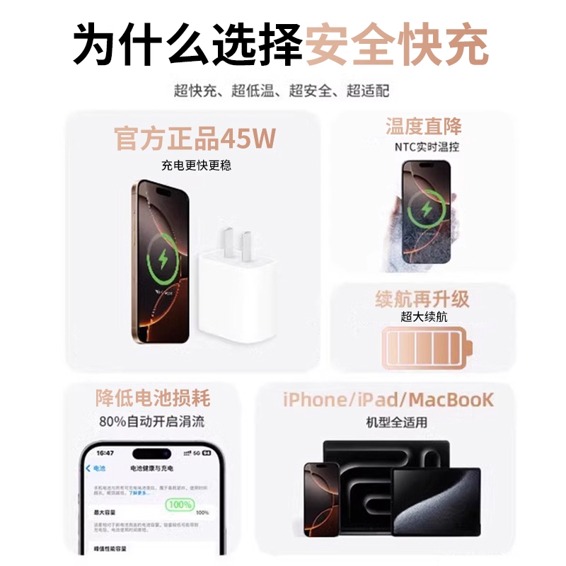【iPhone17首选】【45W快充】TAFIQ适用苹果17promax充电器头原15正品装手机iPhone16数据线14plus编织平板PD