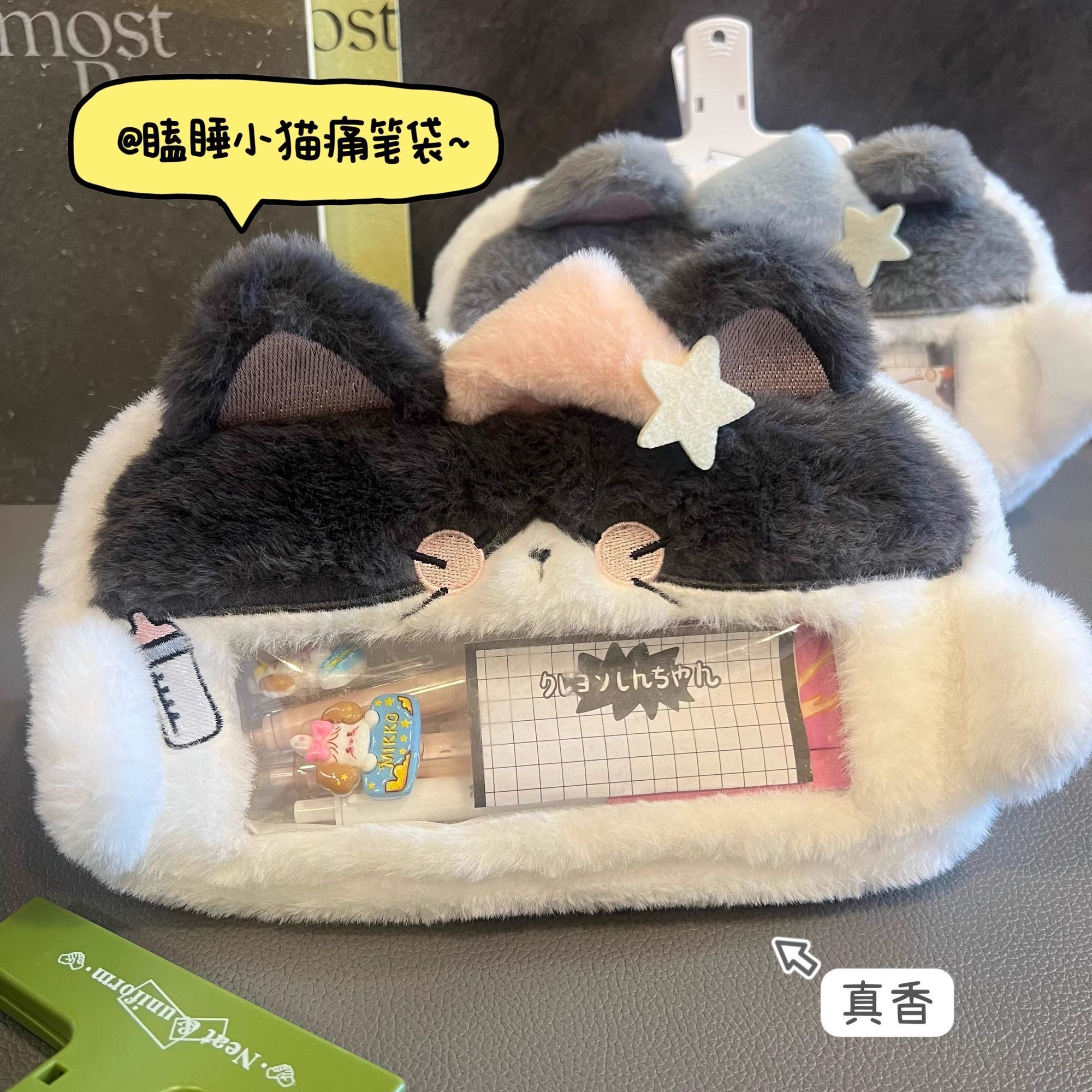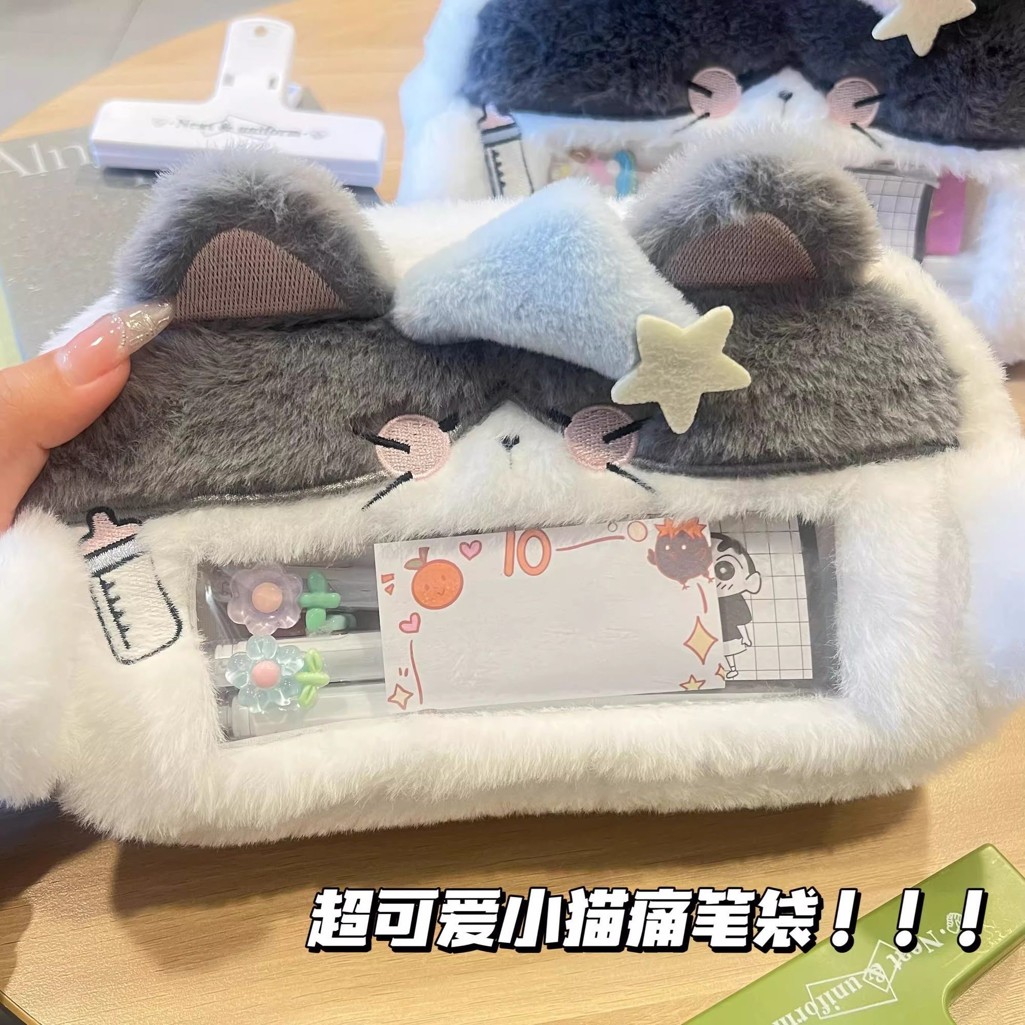 可爱毛绒瞌睡小猫咪笔袋高颜值痛包透明可视大容量学生卡通文具袋