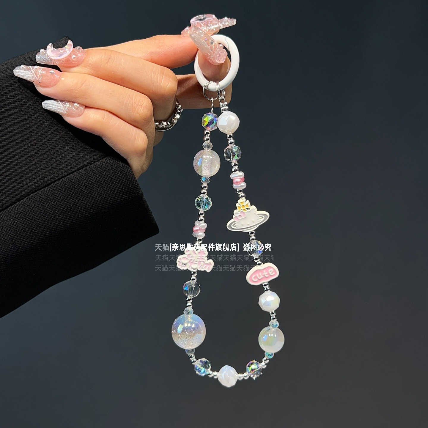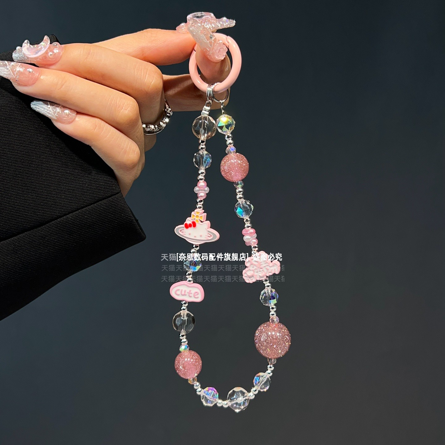 公主发财手机链少女甜美可爱挂链手腕式精致爆闪串珠手链粉色水晶链条ins网红爆款防丢包包挂件钥匙扣猫咪壳