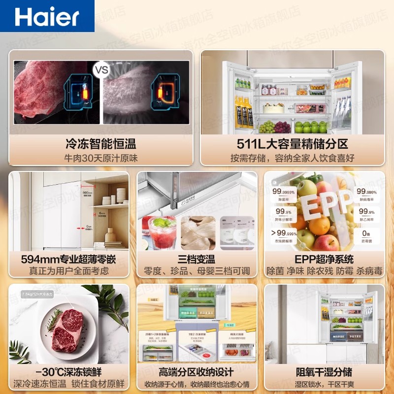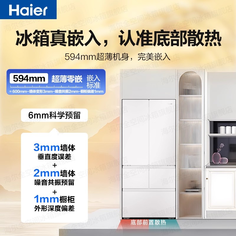 政府换新补贴海尔510L法式四门一级风冷超薄嵌入冰箱