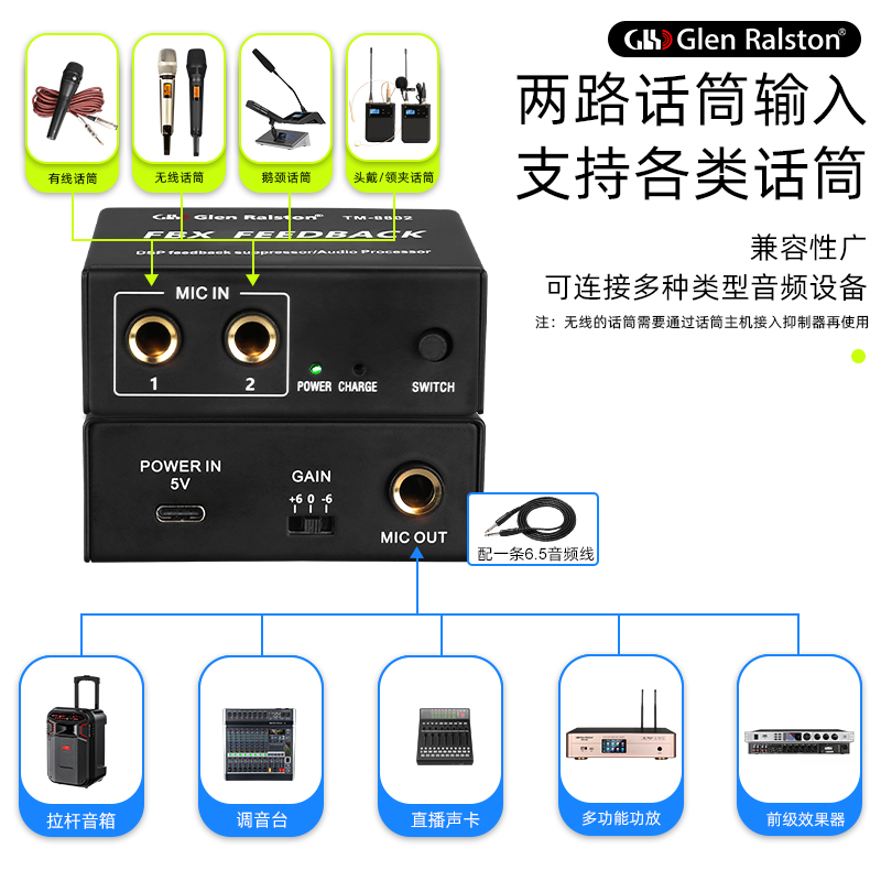 Glen ralston/格伦士顿户外充电直播防啸叫抑制器小型反馈器二路