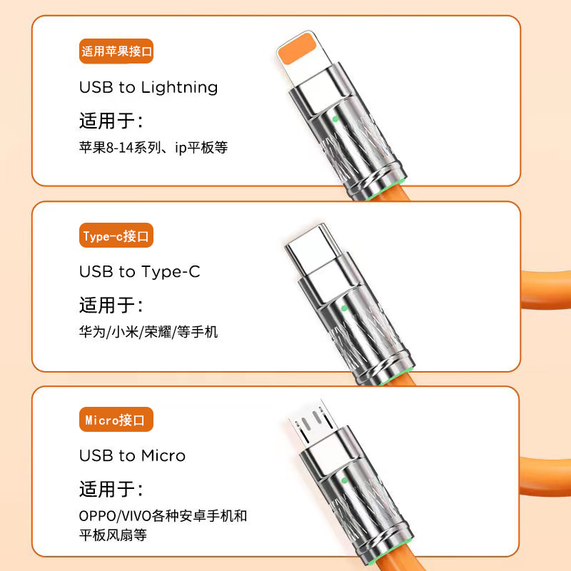 新款100w一拖三快充数据线车载三合一带灯超级闪充适用苹果iphone华为荣耀Type-C安卓vivo通用充电器多头