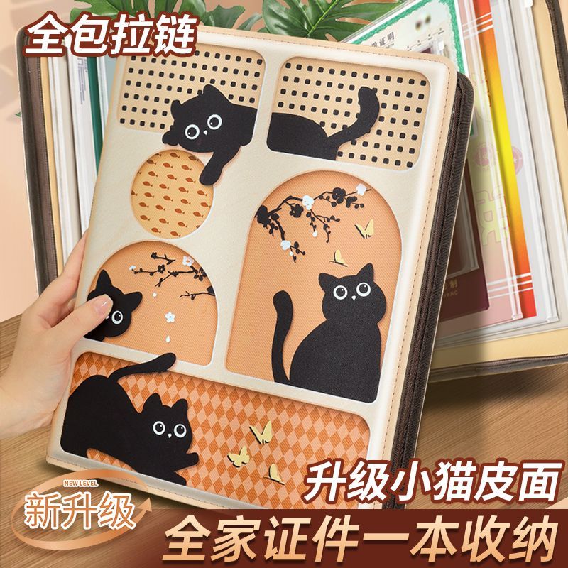 猫咪A4拉链证件收纳包卡包文件户口本疫苗本出生证明护照驾驶证活页册活页多功能收纳本保护套实用型证书票据