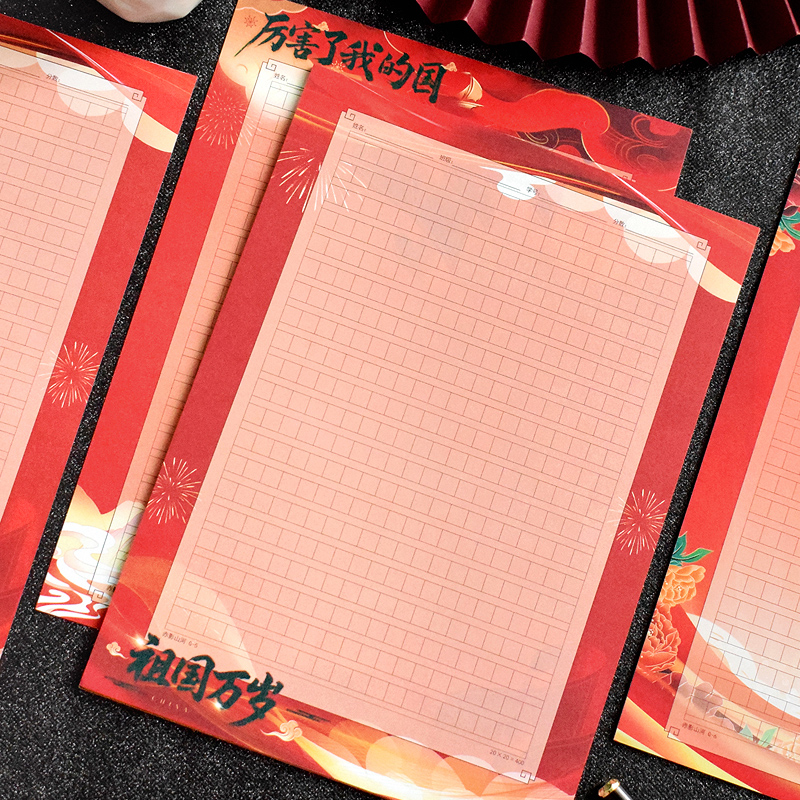 A4大尺寸赤影山河红色硬笔书法展示纸歌颂祖国手写作文纸创作抄写文章告知学生儿童祝福文字信纸田字格练字纸