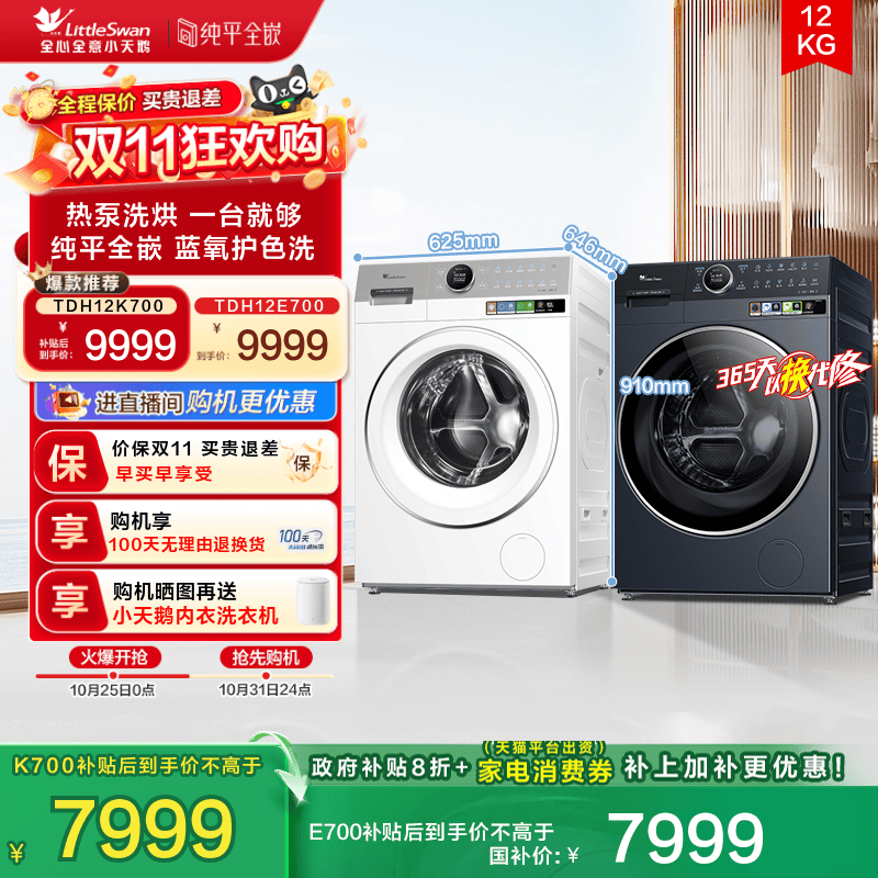 [热泵洗烘一体]小天鹅12KG滚筒洗衣机家用蓝氧2.0全变频E700/K700