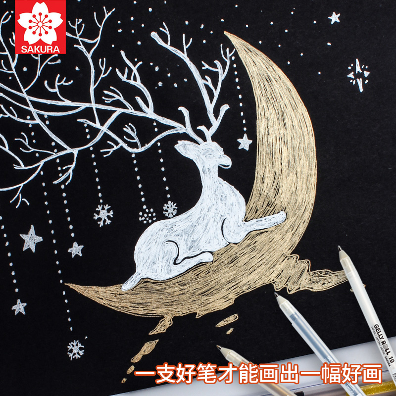 日本樱花高光笔美术专用手帐1.0白笔黑卡笔金色银色细笔芯白字白线笔素描水彩绘画留白勾线笔水性波晒白色笔