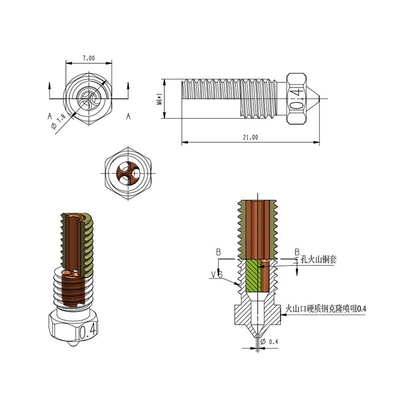 E3D火山CHT三孔克隆喷嘴硬化钢超硬喷嘴喷头 高流量耐磨耐高温