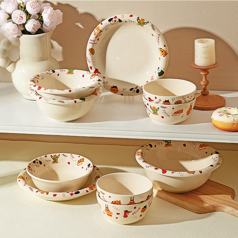 奶油风陶瓷碗家用卡通菜盘子可爱米饭碗汤碗釉下彩儿童餐具耐高温